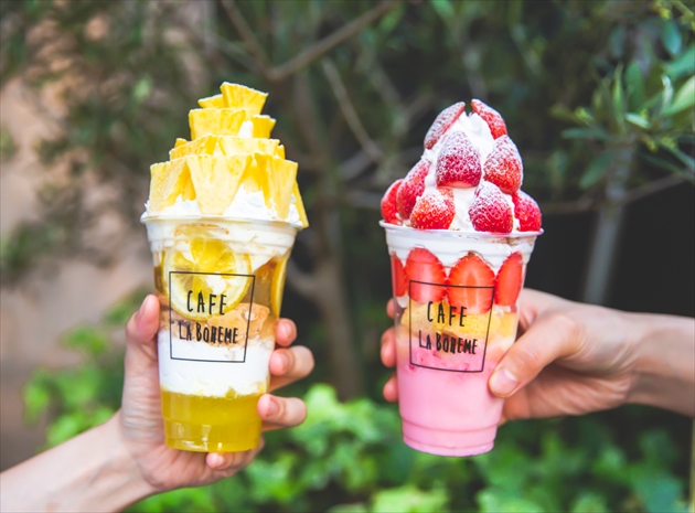 「カフェ ラ・ボエム」「ラ・ボエム クアリタ」にて、定番「いちごのボンボンパフェ