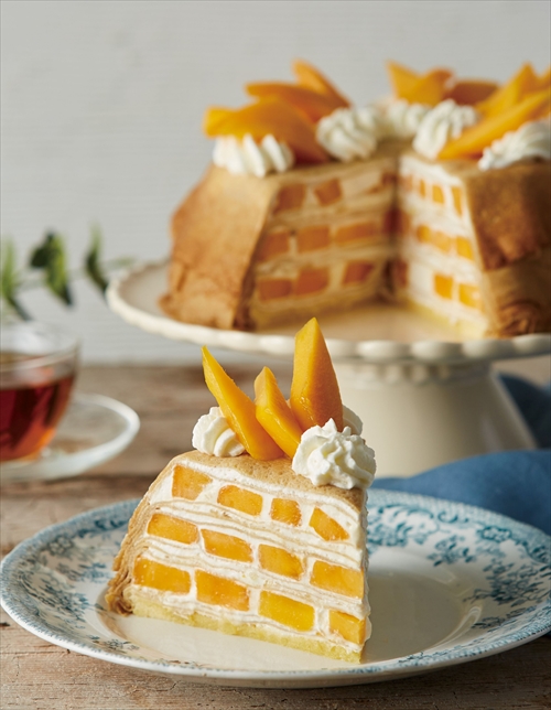 白桃に続いて登場するのは、一枚一枚丁寧に焼き上げたこだわりのクレープに、芳醇な香りのフレッシュマンゴー、キルシュホイップを重ねた「マンゴーのミルクレープ」。アクセントに加えた瀬戸内レモンのジャムが、甘く芳醇なマンゴーを引き立てる夏にぴったりの味わいです。