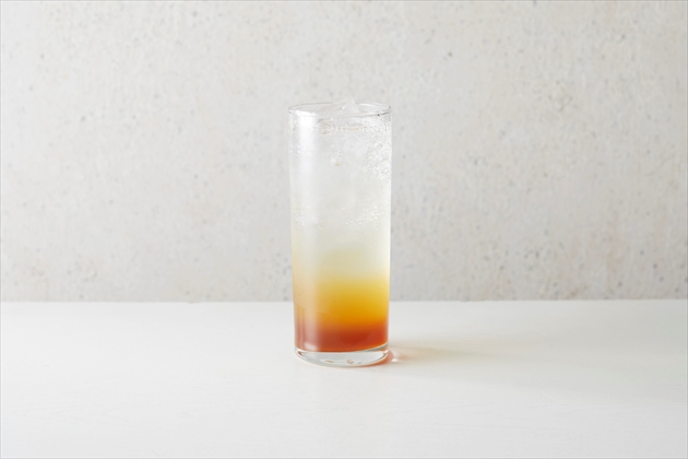 カスカラはコーヒーの果実から種子(豆)を取り除いて乾燥させたもの。そのカスカラから抽出したカスカラティーをベースに中国茶のなかでも華やかさを持つジャスミン茶、似ているようで似ていない二つを掛け合わせ、炭酸で割りました。ジャスミンの華やかな香りが柑橘系のカスカラの風味を引き立て、上品ですっきりとした紅茶のような味わいを生み出しています。淡い黄色のジャスミンティーとオレンジ色のカスカラが混ざり合うときにできる綺麗な色のゆらぎ、それぞれの融合をお楽しみください。