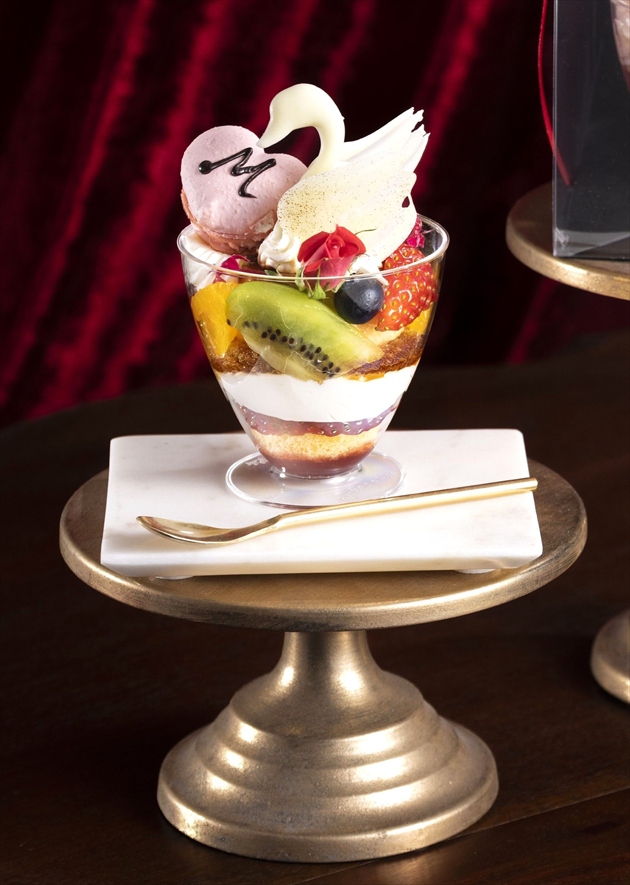 その上には、卵、牛乳、砂糖、バニラのみで丁寧に焼き上げた、シンプルで懐かしい味わいのプリンをのせ、豪華なデコレーションを施しています。凜とした美しさのチョコレートのスワンをはじめ、青木さんのイニシャル「M」を施したベリーマカロン、紅白の食用花を添え、さらにオレンジ、キウイ、ブルーベリー、苺など、色とりどりのフルーツを贅沢に盛り付けました。