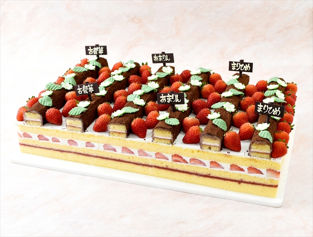 いちご狩りをご自宅で!当社伝統のショートケーキの上に、貴重なプレミアムいちご(あまりん、古都華、まりひめ)をのせ、いちごジャムを忍ばせたいちごクリームの上にチョコクリームとチョコクラムをあしらって土手を作り、いちご畑を再現しました。『あまりん』の濃厚な甘さ、『古都華』のコクのある味わい、『まりひめ』の甘味と 酸味の絶妙なバランスを食べ比べていただく、いちごが主役のケーキです。