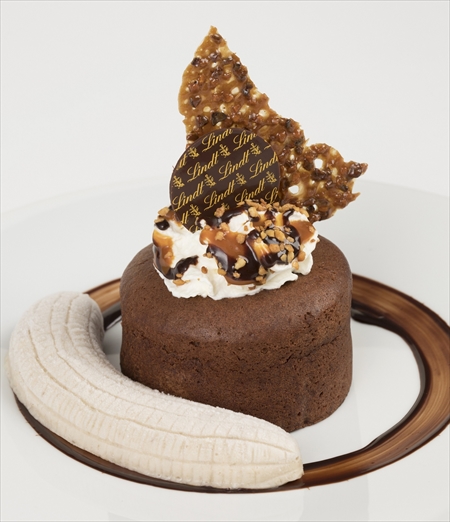 チョコレート生地の上には、サクサクとした食感のヘーゼルナッツのクルスティヤン、濃厚なバナナのアイスクリーム、ダークチョコレートとキャラメルの2種類のソース、薄くパリッとした食感が楽しめるリンツのロゴ入りチョコレートのデコレーションが施されています。
