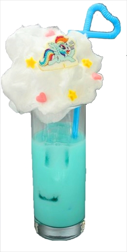 ピンク色のポニーのキャラクター“ピンキーパイ”や紫色の“トワイライトスパークル”が、可愛らしく変身したような、ドリンクやデザートをカメラに収めたり、味わったりすることができます。ソーダの上に乗ったふわふわのコットンキャンディーを空に浮かぶ雲に見立て、レインボーのしっぽの水色のペガサス“レインボーダッシュ”が雲の上に乗っているように見える「レインボーダッシュのコットンクラウドキャンディソーダ」や、むらさきいもアイスの間に隠れたトワイライトスパークルが、尻尾と顔をのぞかせている「トワイライトのマジカルアイスパフェ」など、ここでしか楽しめない13種類の様々なメニューが登場します。