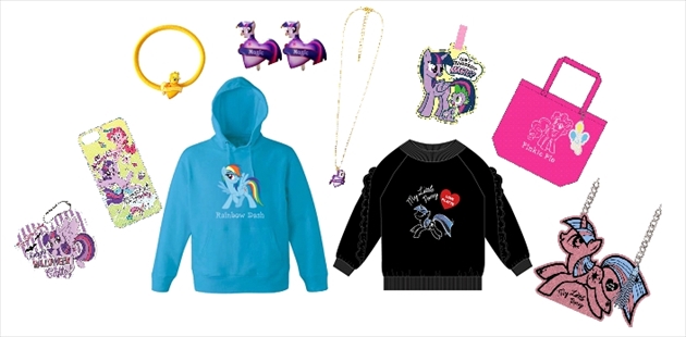 「MY LITTLE PONY Pinkish Cafe」の他、ティーンガールに絶大な人気を誇るブランドとの初コラボレーションによって数々のファッションアイテムが誕生します。カフェの1階にあるアパレルブランド「PINK-latte(ピンクラテ)」では、「MY LITTLE PONY」をデザインした秋冬にぴったりのトップスやポーチ、アクセサリーが並びます。オシャレで可愛いキャラクターアパレルと雑貨を取り扱う「パニカムトーキョー」では、パーカーやトートバッグなど約30種類ものアイテムを展開、世界最大のアクセサリーストア「claire’s(クレアーズ)」原宿店では、6つのPONYキャラクターの個性を生かしたイヤリングやネックレスなどのアクセサリーが展開いたします。