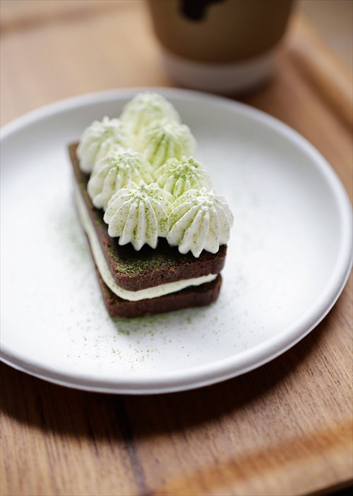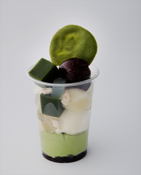 宇治抹茶をふんだんに使用した抹茶羊羹、抹茶クリーム、サクっとした食感の抹茶のチュイールに、爽やかな風味のレモン寒天とレモンゼスト入りの白玉を合わせています。